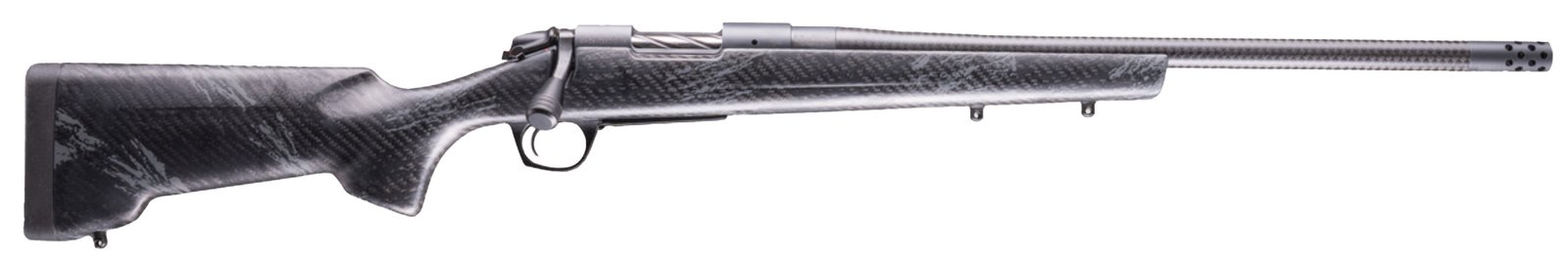 The Cima CF (Carbon Fiber) delivers for hunters who appreciate the balance and feel of a classic sporter-style rifle. It’s built for those who also demand modern innovation and reduced weight. Weighing in at just 5.8 pounds it’s the lightest rifle ever in our B-14 lineup. – While the industry continues to push toward lighter rifles few have done so without compromising on performance and reliability. The Cima CF changes that. Engineered with cutting-edge materials and proprietary manufacturing methods it’s designed to deliver unwavering accuracy repeatable performance and rugged dependability in the harshest conditions. – The foundation of the Cima CF is its RTM sporter stock crafted using a Resin Transfer Molding (RTM) process. This advanced method results in a 100% carbon fiber stock that’s not only rigid but also incredibly light just 18 ounces. – Inside an SMC carbon mini-chassis is precision-fit to provide the action with a solid bedding platform. This ultra-light chassis adds critical stiffness and rigidity without unnecessary weight maximizing both structural integrity and accuracy. – Paired with our Bergara CURE carbon barrel every element of the Cima CF is engineered for maximum weight reduction without sacrificing performance. – Barrel – CURE® Carbon Barrel – No. 6 Barrel Taper – Threaded 5/8×24 with Omni Muzzlebrake – Finish Sniper Grey Cerakote® – Stock 100% Carbon Fiber with Carbon Spine & SMC Carbon Mini Chassis’