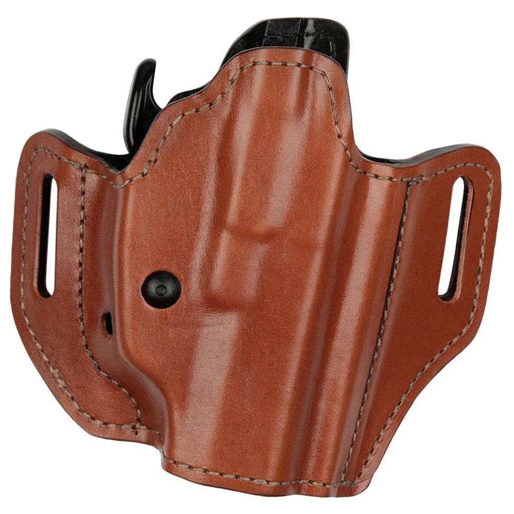 The Bianchi 126GLS Assent is an open-top holster with a high-ride hip carry. The 126 offers a low-profile contoured body-hugging design with GLS (Grip Locking System) an innovative technology that automatically secures the weapon when holstered and releases it upon application of the middle finger with a standard shooting grip for a more intuitive and safer release. Highly versatile the 126GLS is customizable and adjusts to securely fit over 250 firearms. The 126GLS Assent combines the luxurious look and feel of a premium full-grain leather exterior with a sturdy laminate synthetic liner. The holster fits 1.5” (38mm) belt widths.