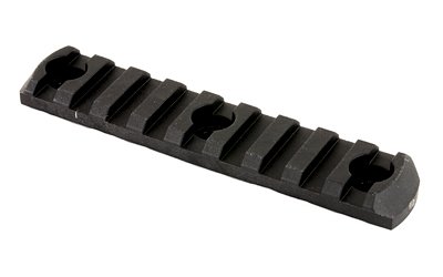 Designed for use with all M-LOK compatible Hand Guards and Forends, M-LOK Polymer Rail Sections provide a cost effective method of attaching various 1913 Picatinny spec rail-mounted accessories such as lights, vertical grips, etc. Injection molded from a proprietary reinforced composite for enhanced strength and durability while remaining lightweight, Rail Sections also feature beveled ends to reduce snagging and eliminate sharp corners and edges. All hardware necessary for attachment directly to M-LOK Slots on either aluminum or polymer hand guards and forends is included. 9 Slots, max overall length of 4.1 in. Made in U.S.A.