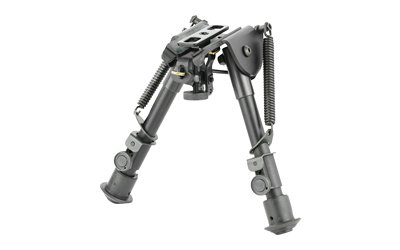 This compact size precision grade bipod with smooth tension legs mounts directly onto most sling swivel studs. It includes three adapters for flexible installation including an AR-15 GI handguard adapter, universal rifle barrel mount adapter and a Weaver/Picatinny type rail adapter with sling stud. It features a durable aluminum and steel construction, and is height adjustable from 5.5″ to 8″.