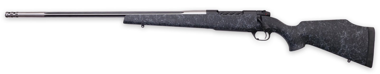 The Mark V® Accumark has stood the test of time and offers the quality craftsmanship one expects from a Weatherby. Built on the legendary Mark V action and equipped with a #3 contour barrel the Accumark was made for long-range range accuracy. – FINISH – 2-Toned Fluted Barrel- Spun Stainless w/ Graphite Black Cerakote – Receiver / Bolt / Bolt Knob / Safety- Graphite Black Cerakote – Stock- Hand-laid raised Monte Carlo fiberglass stock with matte gel coat and spiderweb accents